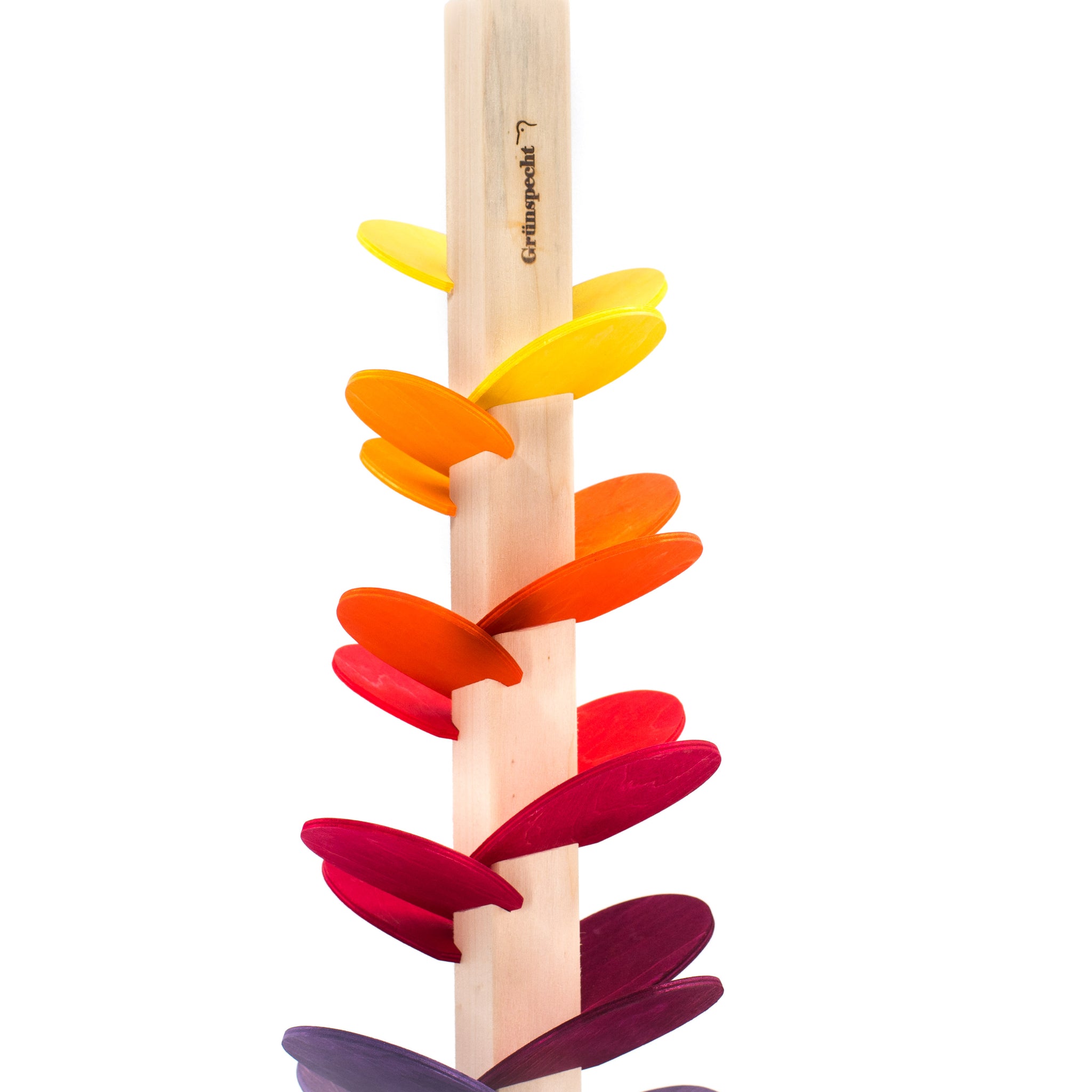 Every design aspect of the Grunspecht Marble Tree is intentional. The glass marbles, the type of wood used (Birch and Maple); the spacing between the petals; the number of petals; the length of the trunk; and even the plant based dyes; all contribute to the final melody. A change in any of these design elements alters the original intended effect.