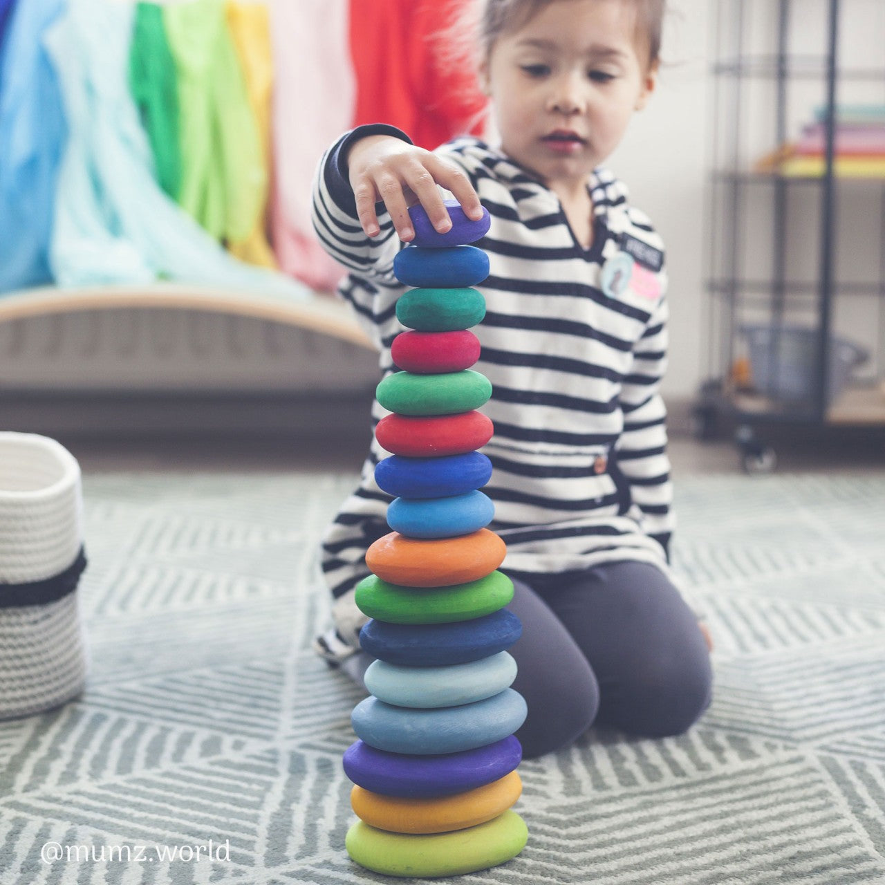 The Grimm’s wooden pebbles at Reverie Craft is a versatile piece and great for open-ended play. The smooth pieces of organically shaped timber in bright inviting colors are great size for little hands, they are appealing to the eye and to the touch and a wonderful addition to imaginative play.