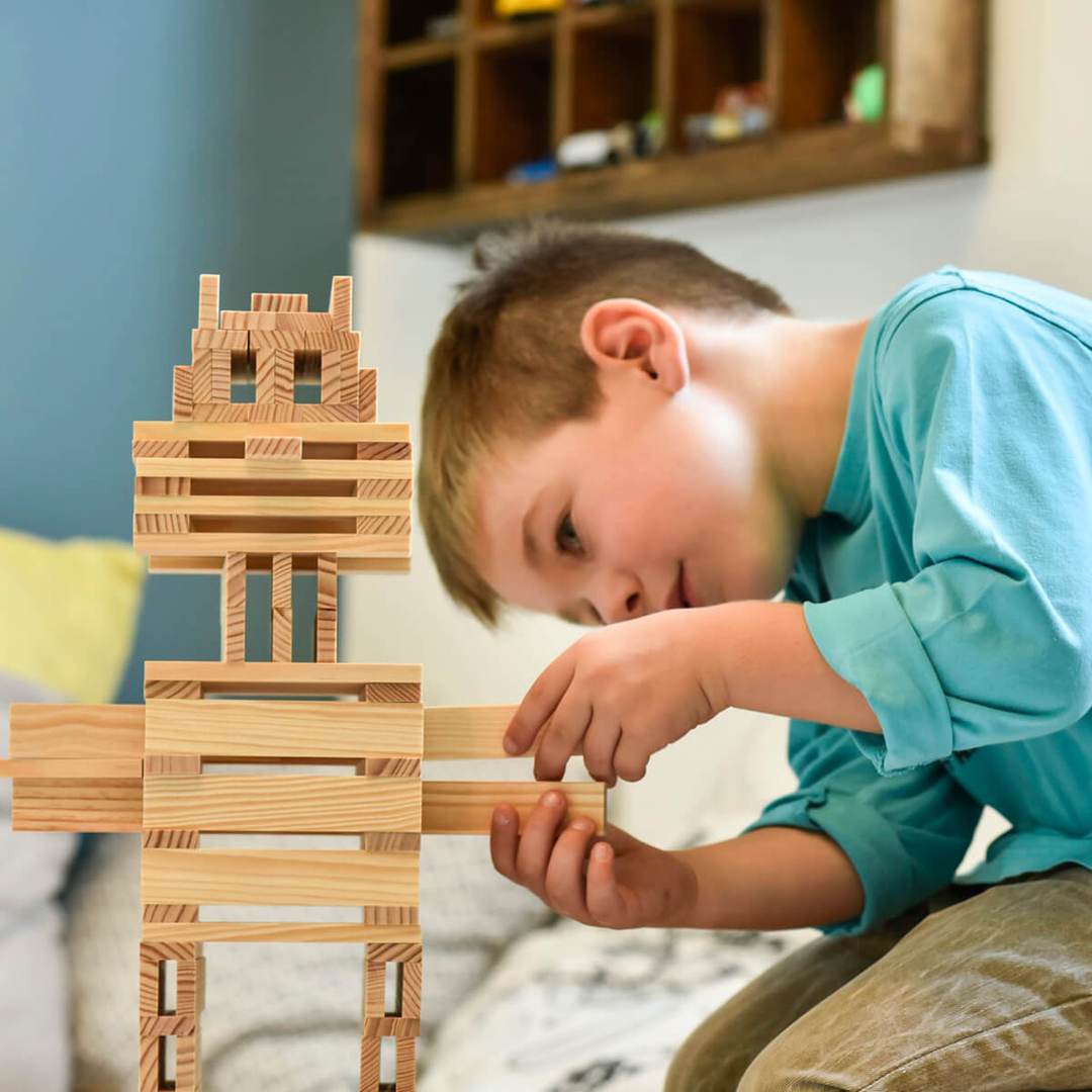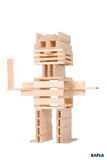 Their untreated natural wood texture provide adequate grip to optimize building. Designed with a golden ratio of 1:3:5 - meaning 3 planks stacked are equal to the height of 1 plank standing up on its side, and 5 laid across is equal to the longest side of a plank, this ratio and its uniformity allows children 3+ to adults to create the most versatile creations imaginable according to their own skills level, and it's possible to build real big structures - castles, animals, towers, towns, ball runs and so much more.