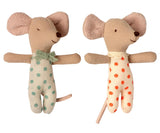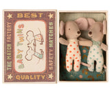 Cute as can be! Two sweet baby mice, one asleep one awake. They sleep safely in their double sleeping bag and matchbox bed. The set comes with a floral sleeping bag in a nicely decorated handmade matchbox