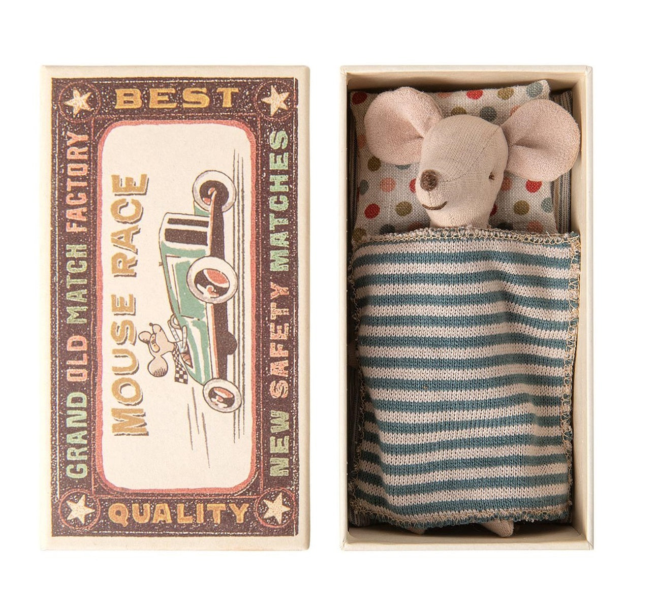 Big Brother mouse is simply adorable. His bed is always ready and he sleeps tight in his little matchbox. The beautiful bed linen is made of soft fabrics with beautiful print.