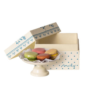 The delicious macarons comes in a gift box with a little hand painted cake stand - a must have for every Maileg toy dinner party.