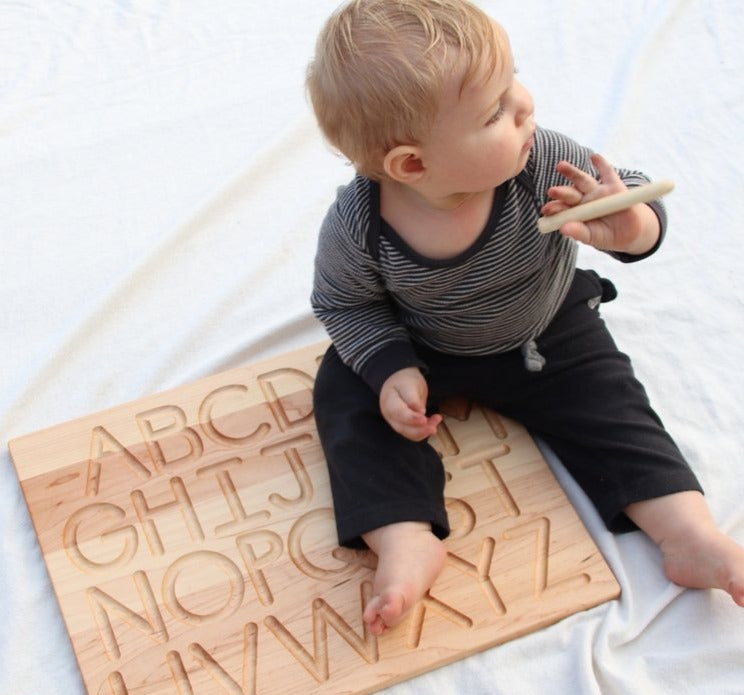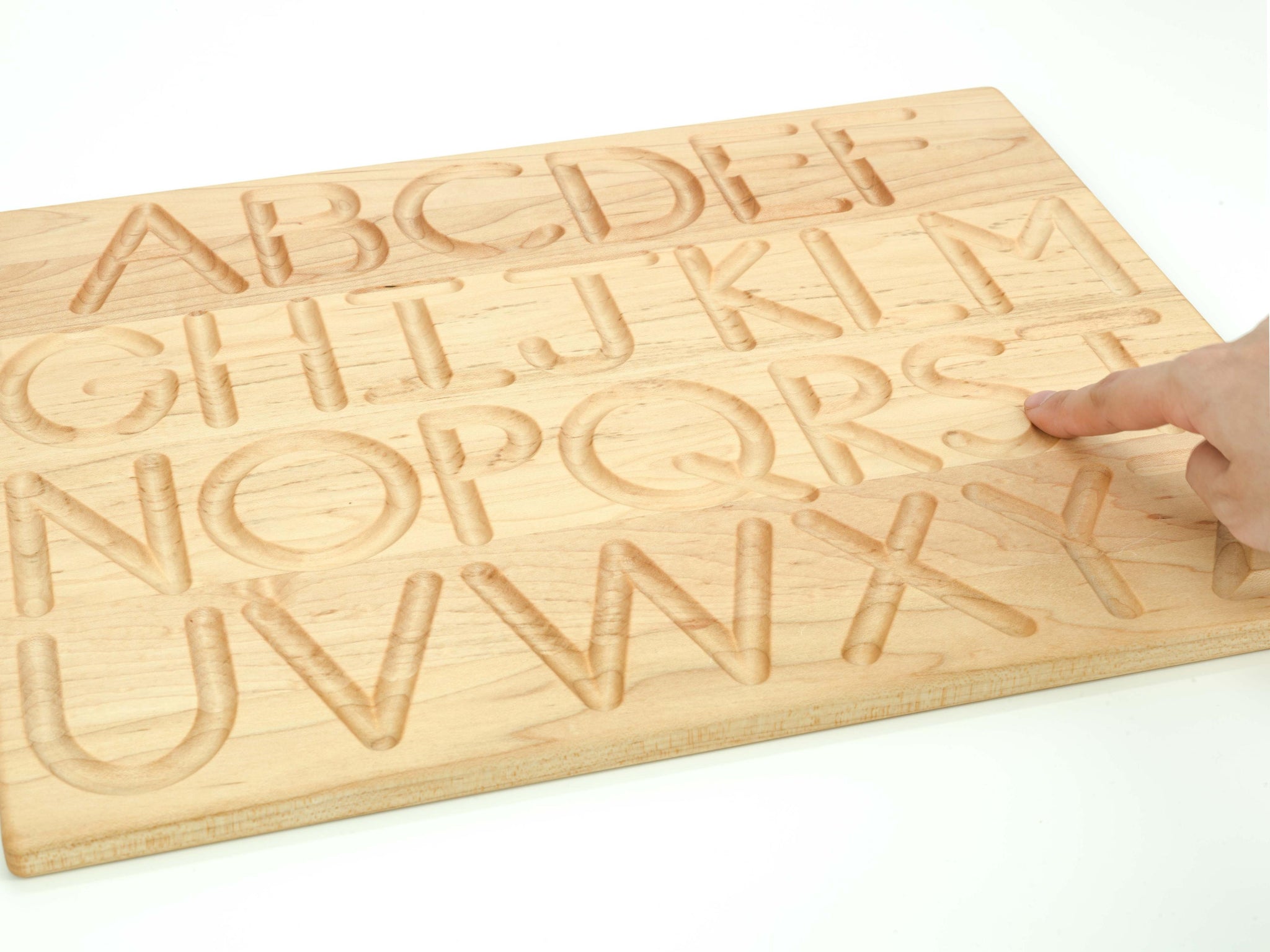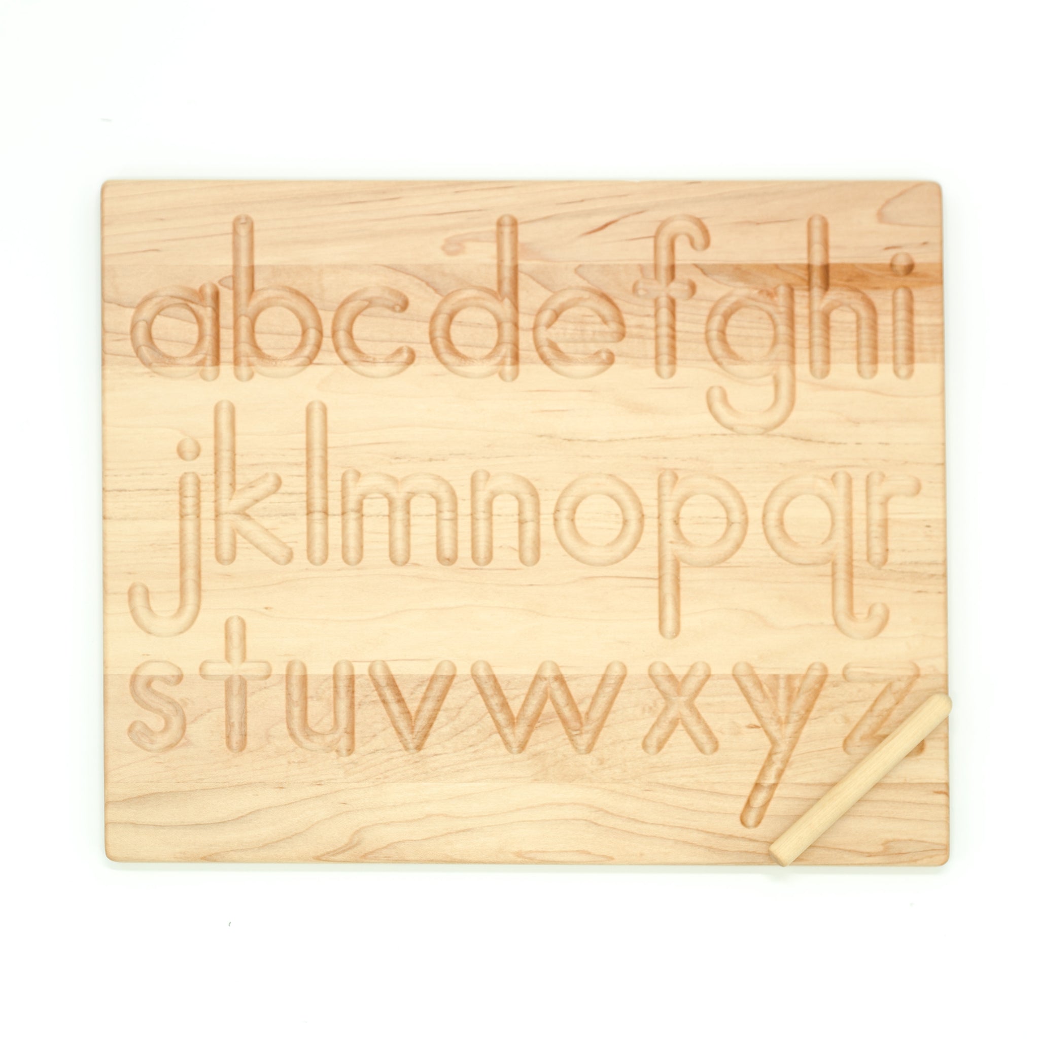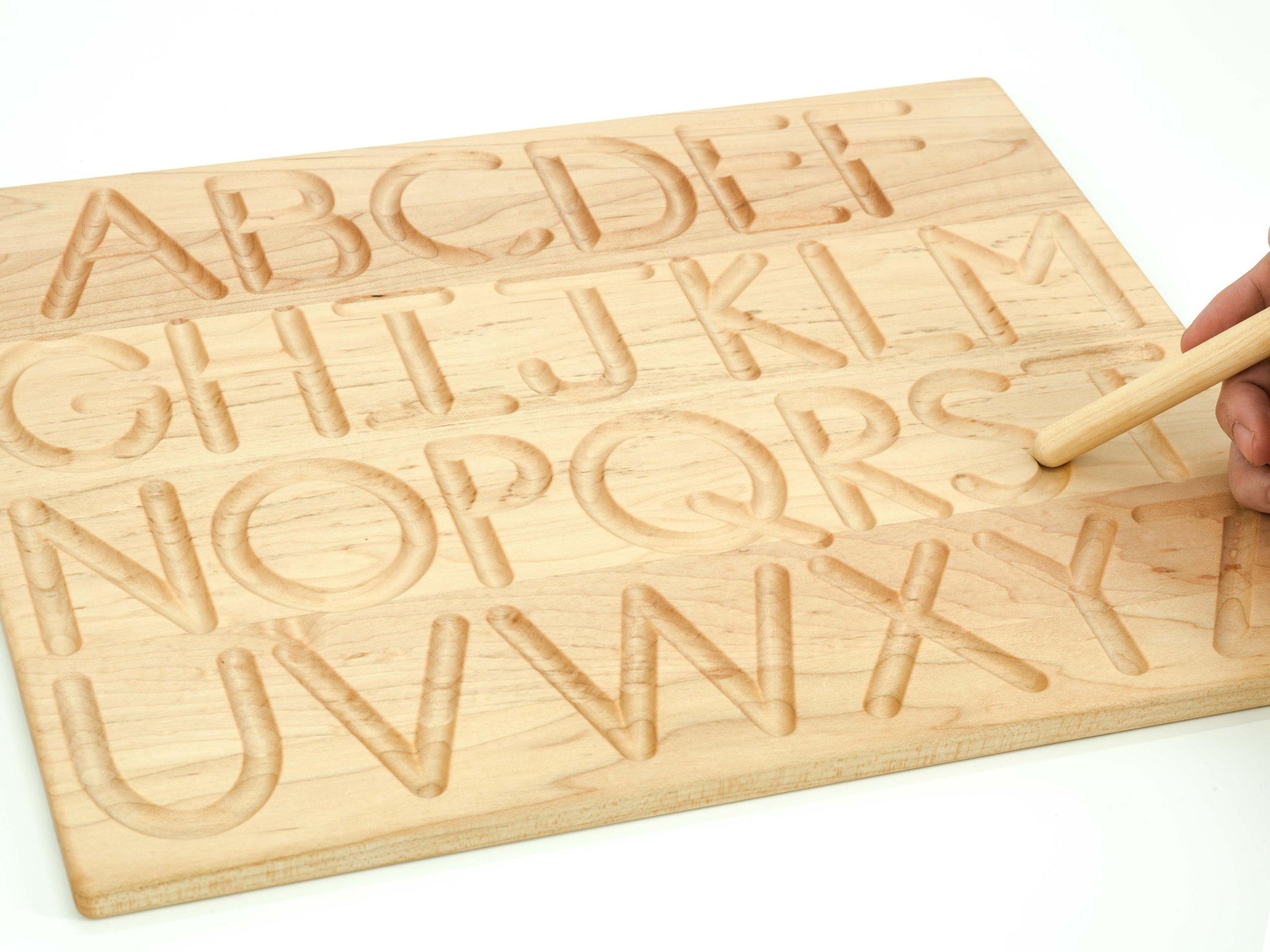 Handcrafted with durable maple hardwood in exceptional quality. The alphabets are engraved with gently curved grooves, providing a form to trace with either finger or the included tracing stick.