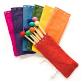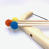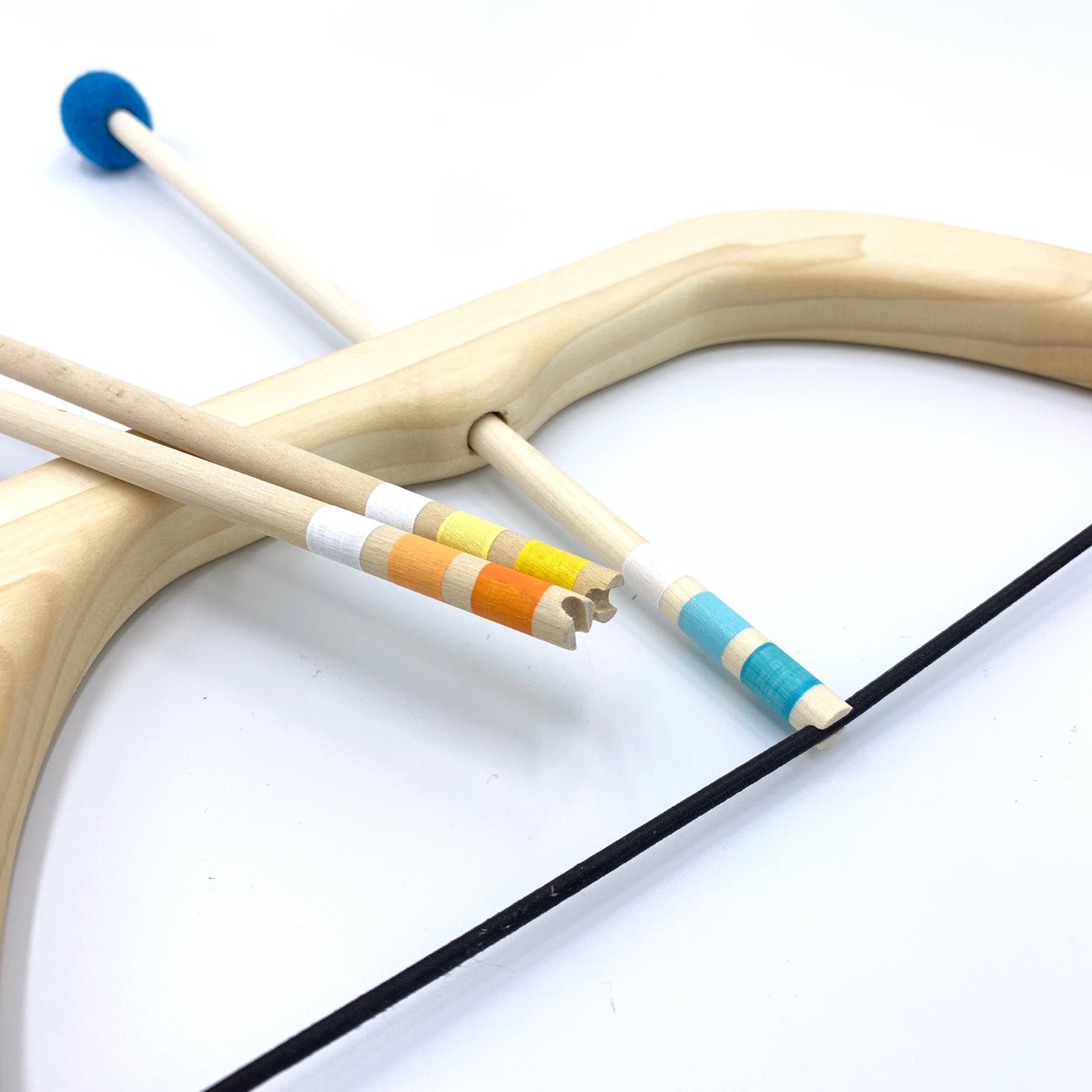 Each arrow is tipped with a soft wool ball for a softened impact, and has a notch to fit nicely onto the hole on the bow, which helps guide the arrow for young archers to shoot successfully. Handmade with solid ash wood, sanded to a smooth finish, and painted with color stripes on the ends of each arrow. The felted quiver in this set let children carry the arrows around easily and offers extra imaginative fun!